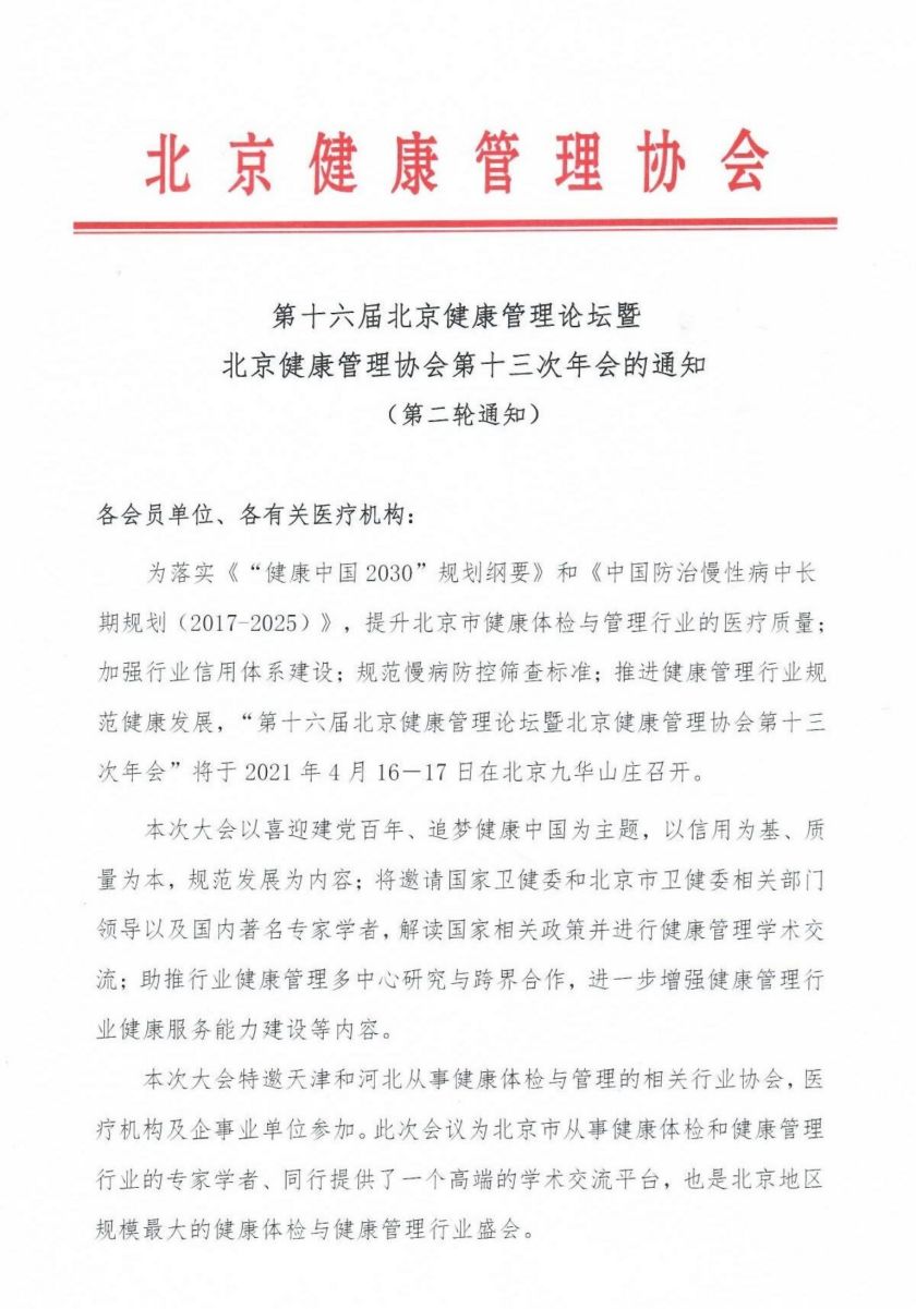 第十六届北京健康管理论坛暨北京健康管理协会第十三次年会的第二轮通知