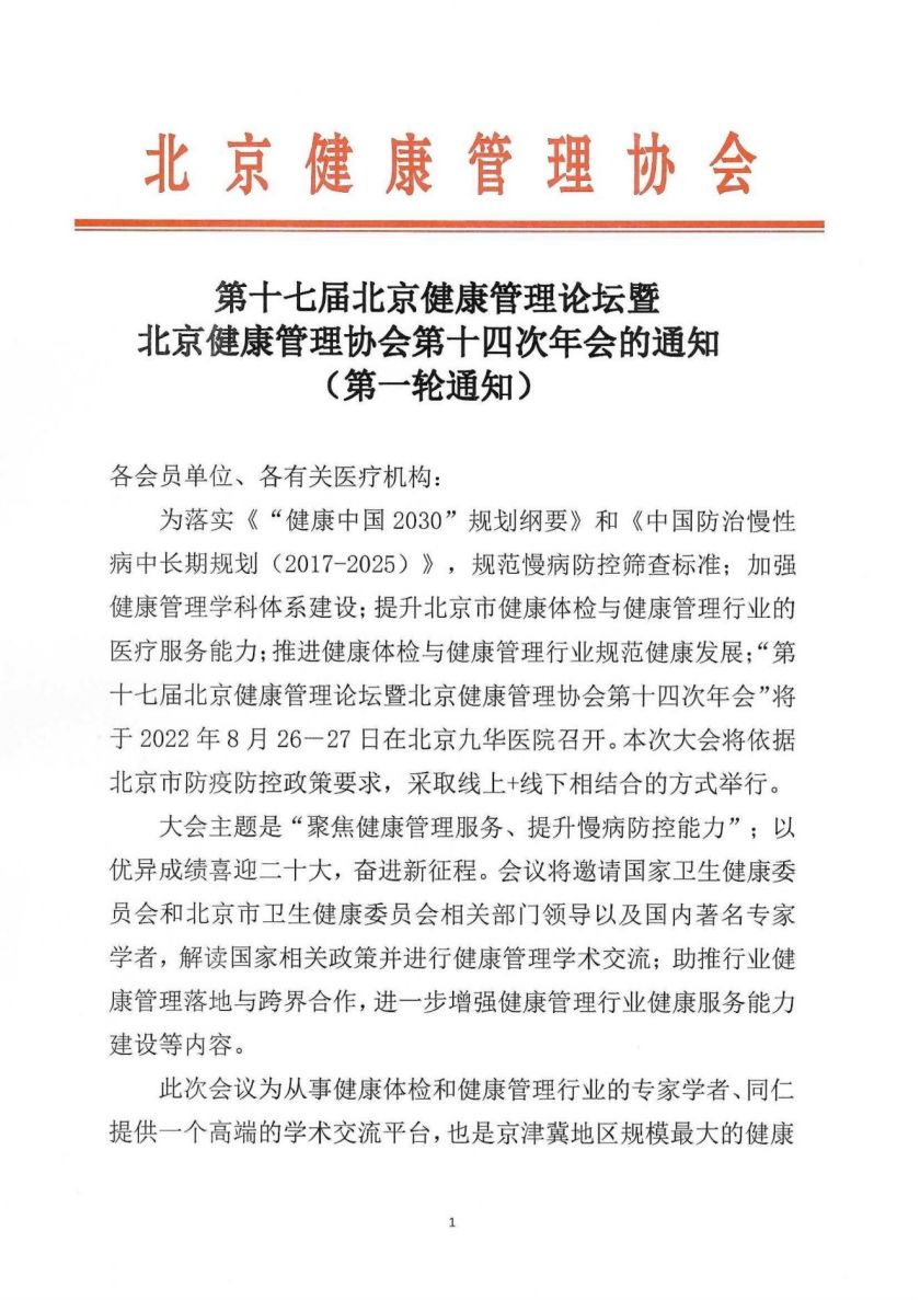 第十七届北京健康管理论坛暨北京健康管理协会第十四次年会通知(第一轮通知)