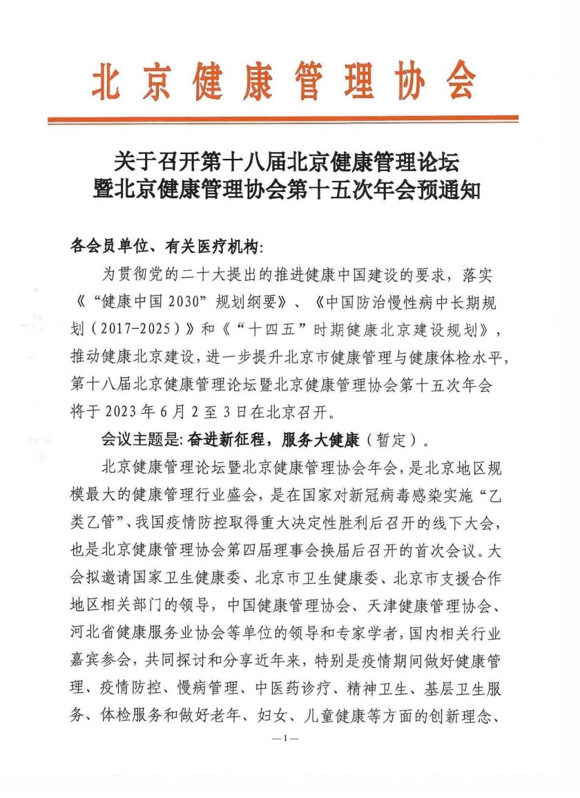 关于召开第十八届北京健康管理论坛暨北京健康管理协会第十五次年会预通知