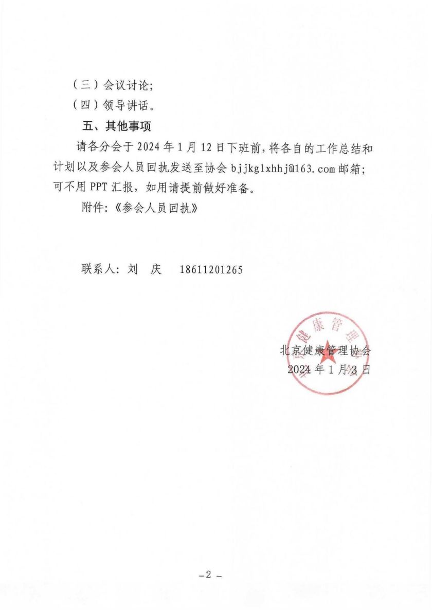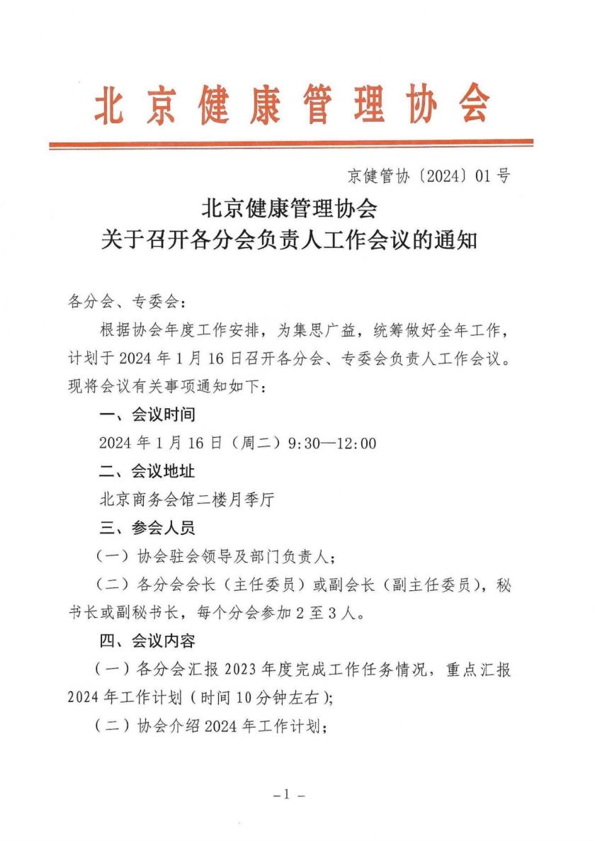 北京健康管理协会关于召开各分会负责人工作会议的通知
