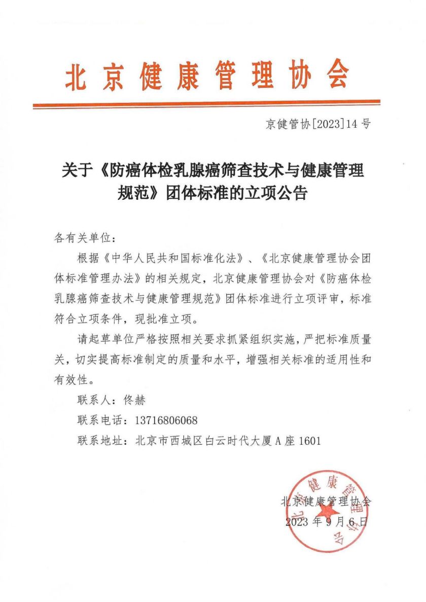 关于《防癌体检乳腺癌筛查技术与健康管理规范》团体标准的立项公告