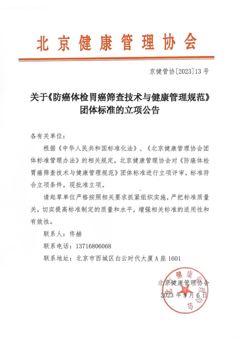 关于《防癌体检胃癌筛查技术与健康管理规范》团体标准的立项公告