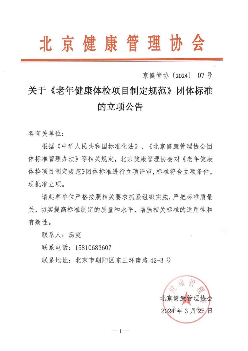关于《老年健康体检项目制定规范》团体标准的立项公告