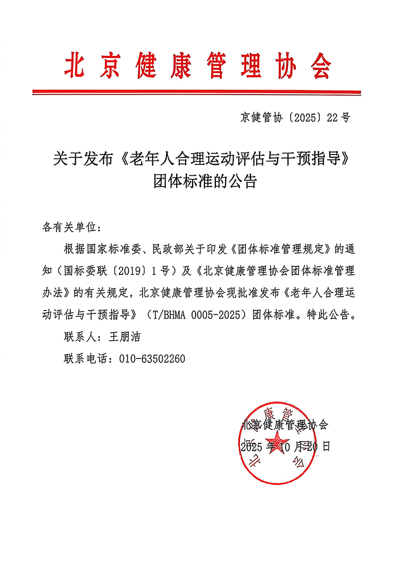 关于发布《老年人合理运动评估与干预指导》团体标准的公告