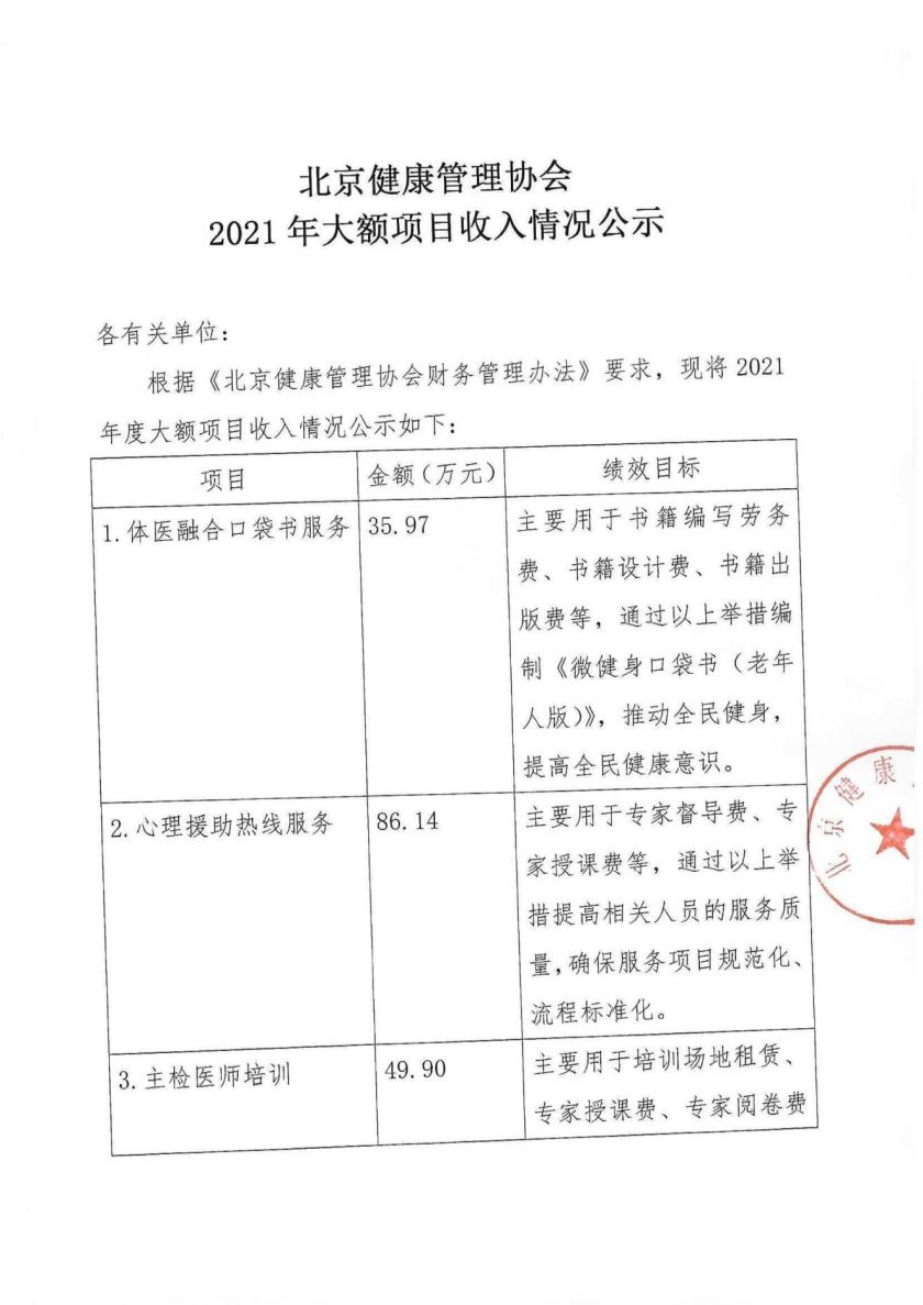 北京健康管理协会 2021年大额项目收入情况公示