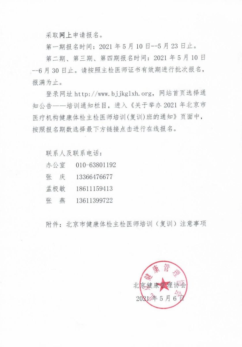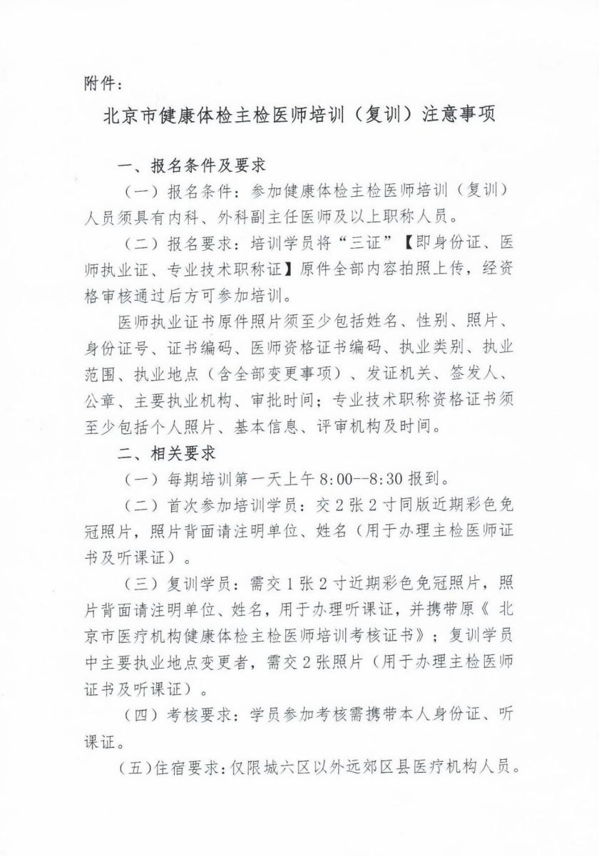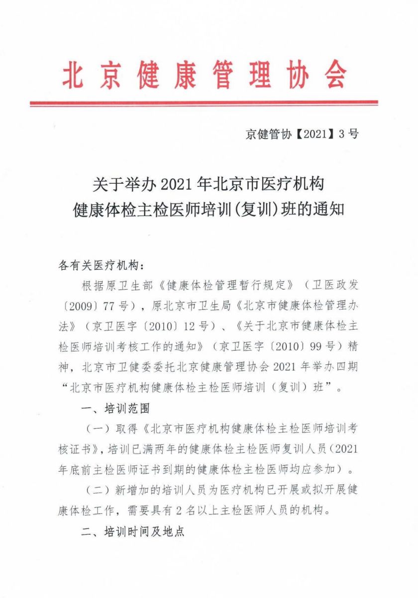 关于举办2021年北京市医疗机构健康体检主检医师培训(复训)班的通知