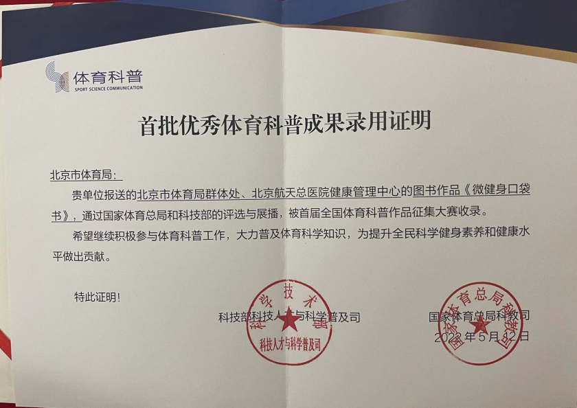 2022年5月《微健身口袋书》通过国家体育总局和科技部的评选与展播,被首届全国体育科普作品征集大赛收录,并鼓励继续积极参与体育科普工作,大力普及体育科学知识,为提升全民科学健身素养和健康水平做出贡献。