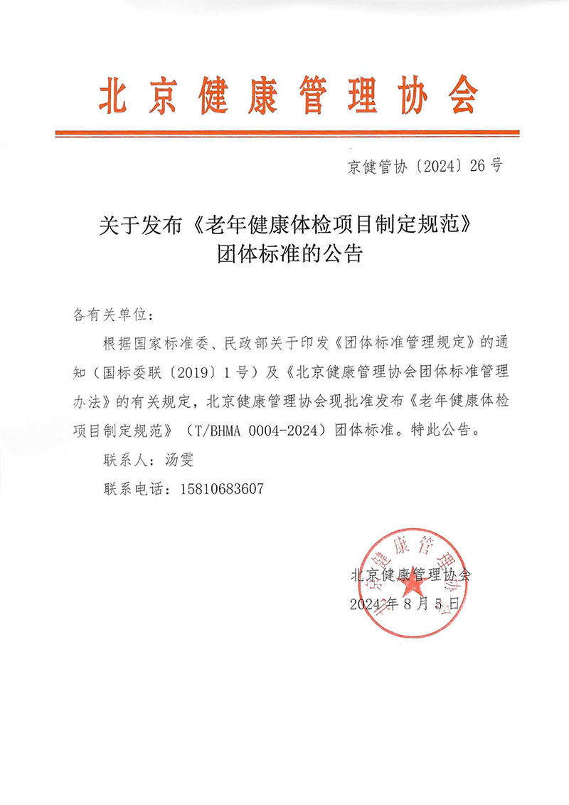 关于发布《老年健康体检项目制定规范》团体标准的公告