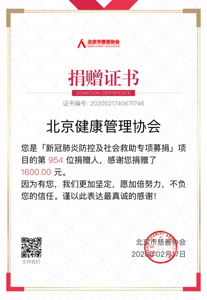 近几天,协会部分人员陆续向武汉疫区捐款。协会和党支部根据联合党委的号召,组织员工向北京市慈善协会捐款。大家一致认为虽然我们的捐款数额有限,但只要我们全社会众志成城,形成不可抗拒的强大合力共同抗击疫情,我们就一定能尽快全面战胜新冠肺炎疫情。