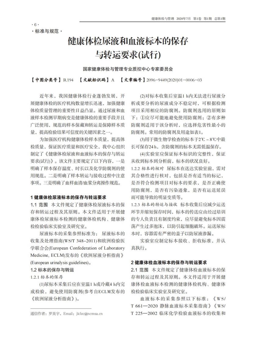 健康体检尿液和血液标本的保存与转运要求(试行)